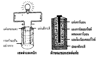 2.1 เซลล์แห้ง (Dry Cell ) ประกอบด้วยกระป๋องสังกะสีซึ่งใช้เป็นขั้วลบ และมีแท่งคาร์บอนอยู่กลางซึ่งเป็นขั้วบวกส่วนสารละลายอิเล็กโทรไลต์จะใช้สารละลายของแอมโมเนียคลอไรด์ผสมแมงกานีสไดออกไชด์ ที่ก้นกระป๋องจะมียางมะตอยกับยาง กั้นไม่ให้แท่งคาร์บอนแตะกับก้นกระป๋อง ส่วนด้านบน ใส่ขี้เลื่อยหรือยางมะตอยแล้วปิดฝาครอบแท่งคาร์บอน เมื่อใช้เซลล์แห้งจนหมดกระป๋องแสดงว่าสังกะสีกับอิเล็กโทรไลต์ จะทำปฏิกิริยากันจนหมดไม่สามารถจะทำให้เกิดปฏิกิริยาได้อีกจึงไม่มีไฟฟ้าเกิดขึ้น ดังนั้น เซลล์แห้งจึงมีช่วงเวลาการใช้งานได้น้อย